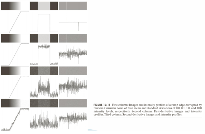 위 이미지는 ramp edge(점진적으로 밝아지는 경계)에 무작위 가우시안 노이즈를 추가했을 때, 원본 강도 프로파일과 1차 2차 미분 결과가 어떻게 변하는지를 보여준다.