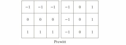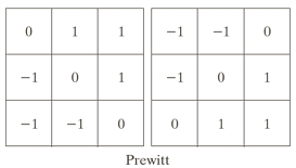 3x3 마스크를 사용하며, 수평 및 수직 방향의 에지를 검출한다. 가중치가 균일하여 계산이 단순하여 간단한 구현에 적합하고, 잡음 억제력이 Sobel보다 낮다.