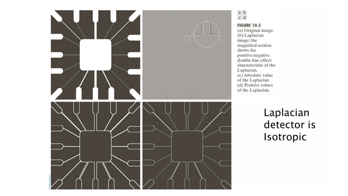 아래 이미지는 Laplacian이 방향성이 없는(isotroppic) 2차 미분 필터로, 모든 방향의 선과 에지를 균일하게 검출하는 모습을 보여준다.