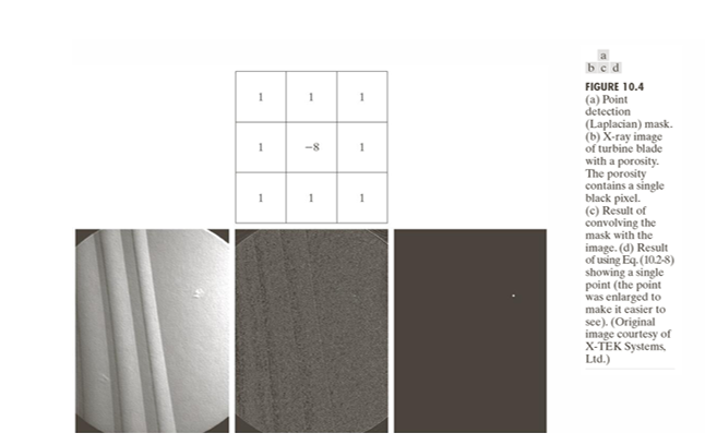 위 행렬은 Laplacian Filter 형태의의 Point detection mask이다. (b) 이미지는 터빈 블레이드의 X-ray 영상으로 내부 기공(검은 점)이 존재한다. (c)는 마스크를 영상에 컨볼루션한 결과이고, (d)는 위 수식을 영상에 적용한 뒤, 검출된 고립점 하나를 시각적으로 보여준 결과이다.