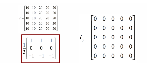 위 그림은 입력 행렬 에 Horizontal 마스크를 적용한 결과 를 보여준다. 위 그림의 필터는 세로 방향(Y방향) 기울기를 계산하는 역할을 한다.
