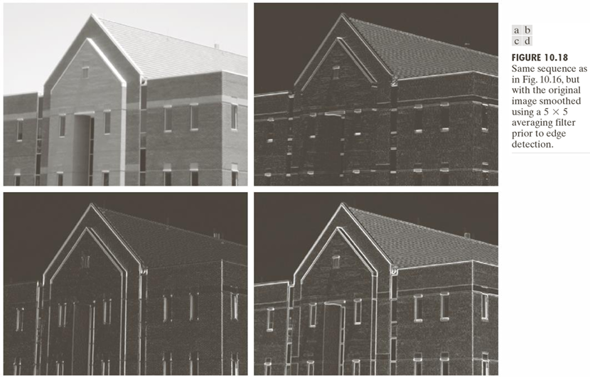 위 Three Fundamental Steps에서 볼 수 있듯이 노이즈의 영향을 줄이는 가장 간단한 방법은 미분 전에 스무딩(평활화)을 적용하는 것이다.