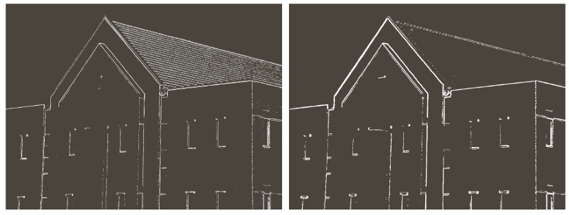 (a) 이미지는 Examples 첫 번째 그림의 (d)에서 얻은 gradient에 33% 임계값을 적용한 결과이다. 잡음과 텍스처 엣지가 많이 사라지고 건물 외곽선 위주로 남은 모습을 확인할 수 있다.