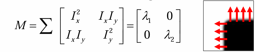 따라서 의 고유값(eigenvalue)을 보면, 변화가 없는 평탄한 영역인지, 한 반향으로만 변하는 에지인지, 모든 방향에서 변하는 코너인지를 구분할 수 있다.