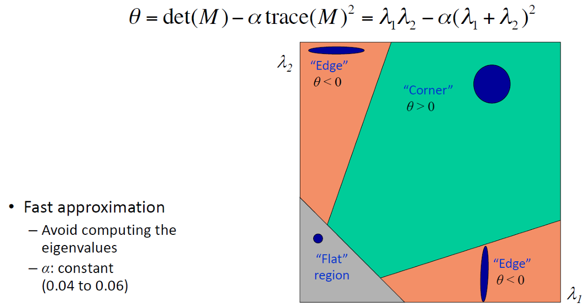 Harris 응답 함수는 고유값을 직접 구하지 않고도 코너 여부를 빠르게 판별할 수 있다.