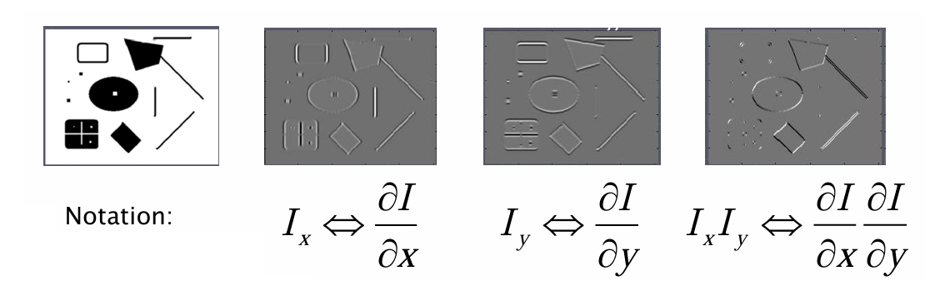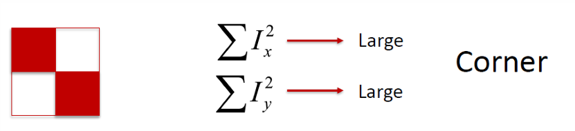 즉, 이 크다는 뜻은 x축 방향(좌우)으로 강한 변화가 있다는 의미이고, 크다는 것은 y축 방향(상하)으로 강한 변화가 있다는 의미이다. 즉, 두 방향 모두 큰 값이면 "코너"임을 의미한다.