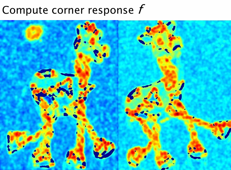 아래 그림은 Harris Detector가 실제로 어떻게 코너 포인트를 응답(responses)하는지 보여준다.