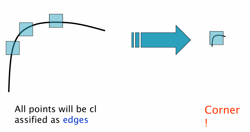 윈도우 크기가 고정된 상태에서 영상이 확대되면, 코너가 더 큰 구조로 바뀌게 되어 국소 윈도우 안에서는 더 이상 코너로 보이지 않는다. 이 경우 Harris 검출기는 코너를 엣지(Edge)로 잘못 분류할 수 있다.