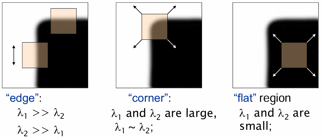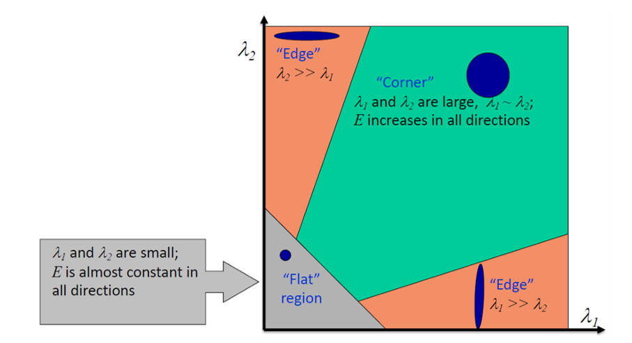 영상의 특정 지점에서 계산된 행렬 의 고유값 는 그 지점 주변의 강도 변화(gradient) 특성을 나타낸다. 이를 통해 해당 지점이 평탄 영역(Flat), 에지(Edge), 코너(Corner) 중 어디에 속하는지를 판별할 수 있다.