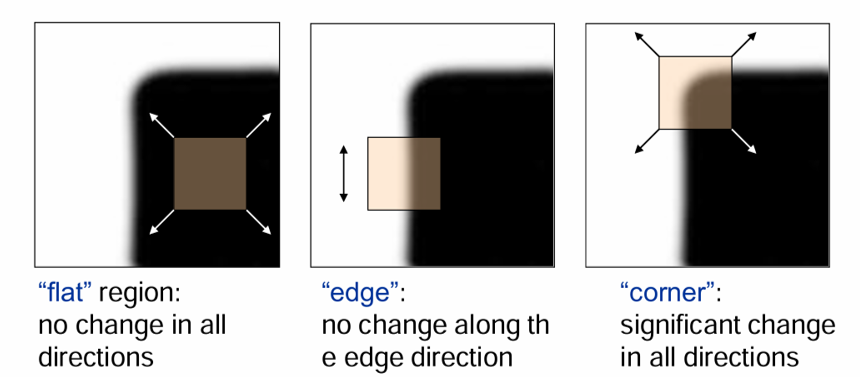 특징점을 찾을 때 가장 중요한 기준 중 하나는, 윈도우(window)를 어느 방향으로 이동시켰을 때 강도(Intensity)가 크기 변하는가이다. Harris 검출기는 이 개념을 수학적으로 모델링하여, 평탄한 영역(flat), 에지(edge), 코너(corner)를 구별한다.