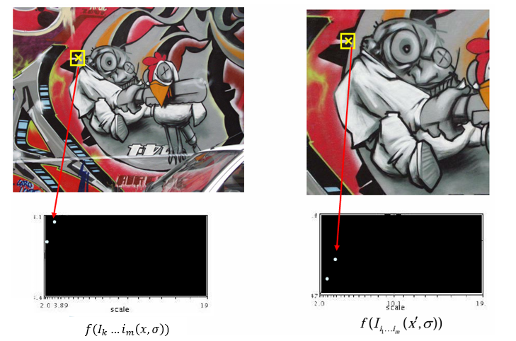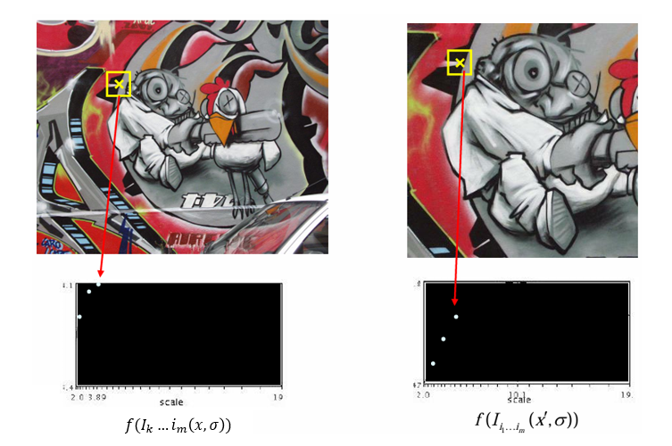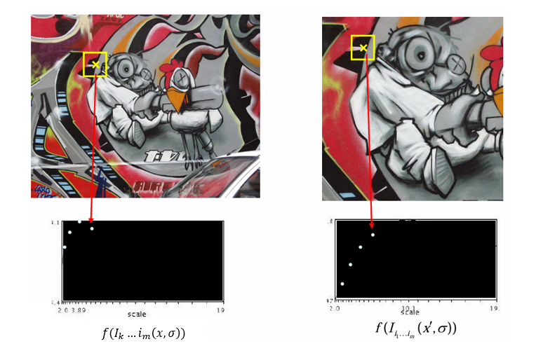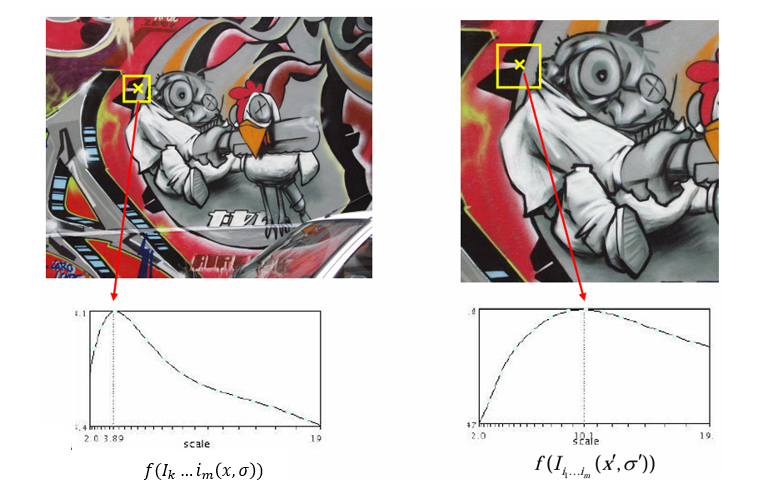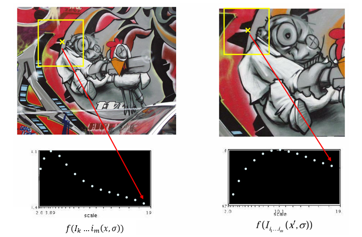 따라서 스케일 변화에 변화하는 함수 를 정의하고, 그 함수가 위치 (x, y)와 스케일 에서 동시에 국소 최대값(local minima)을 가지는 지점을 선택한다.