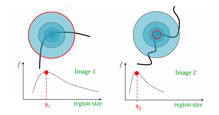 어떤 코너가, 큰 이미지(왼쪽)에서는 큰 영역을 잡았을 때 극대값을 주고, 축소된 이미지(오른쪽)에서는 작은 영역을 잡았을 때 극대값을 준다.
