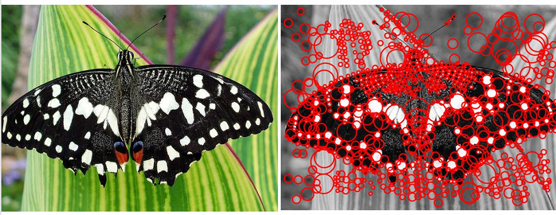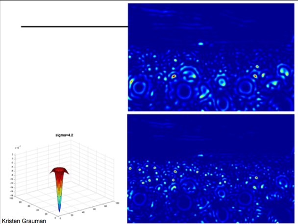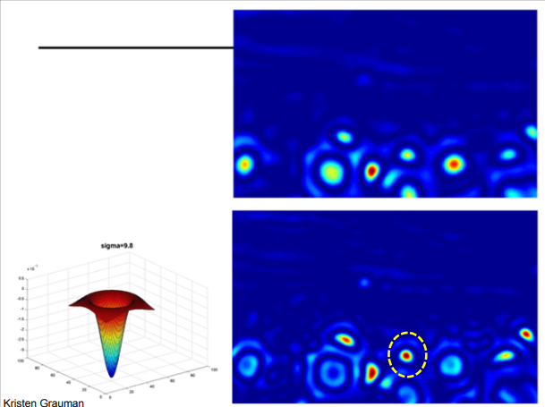 여기서, Laplacian of Gaussian(LoG)를 여러 값(스케일)에서 적용한 뒤, 위치(x,y)와 스케일()에서 국소 극대값(local maxima)을 찾은 결과이다.