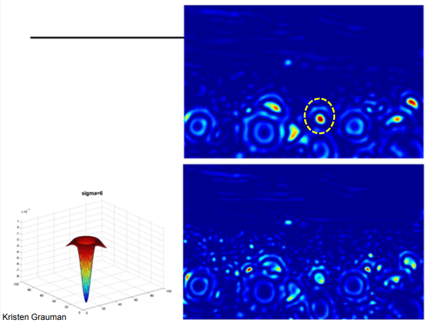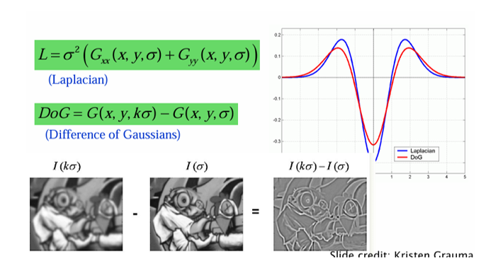즉, 두 개의 다른 를 가진 가우시안 필터링 결과를 빼주면 LoG와 유사한 응답을 얻을 수 있고, 훨씬 효율적으로 계산이 가능하다.