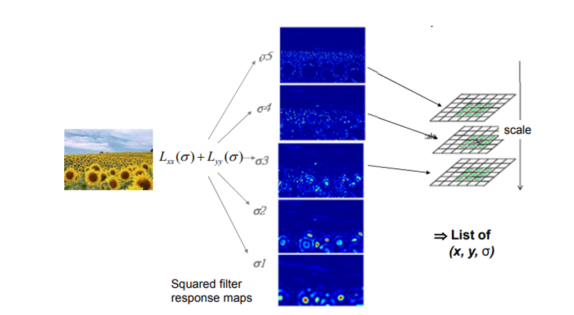 원본 해바라기 사진에서 여러 크기의 해바라기 들이 존재한다. 이때, LoG 기반의 필터를 다양한 로 적용하여, 여러 스케일에서 반응을 측정한다.