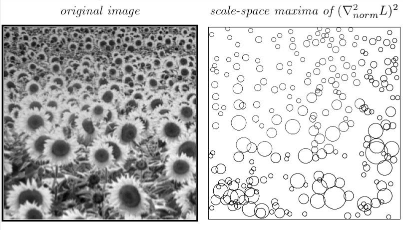 즉, 이 결과는 한 장의 이미지 안에서 객체가 다양한 크기로 존재하더라도, Laplacian 응답의 극대값을 이용하면 각각의 해바라기를 "자기 크기에 맞는 스케일"로 잡아낼 수 있다는 것을 보여준다.