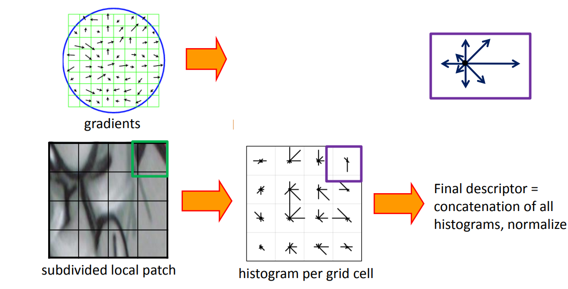특징점 주변의 일정한 크기 패치를 가져온 뒤, 각 픽셀의 기울기(gradient) 방향과 크기를 계산한다. 이를 작은 격자(Sub-patch)로 나누고, 각 격자마다 방향 히스토그램(orientation histogram)을 생성하낟. 히스토그램은 픽셀의 방향성을 일정한 구간으로 나누어 누적하는 방식으로 구성되며, 결과적으로 패치의 지역적인 구조가 요약된다.