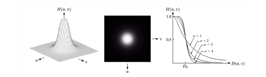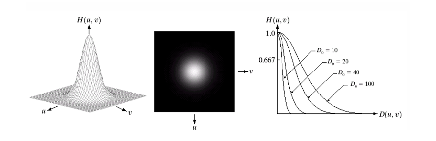 우측 3D로 표현한 가우시안 필터 H(u,v)이고, 가운데는 실제 필터 마스크 이미지로 중앙이 밝고 주변으로 갈수록 어두워진다. 오른쪽은 다양한 값에 따른 곡선으로 곡선이 오른쪽으로 갈수록(값이 커질수록) 더 많은 고주파를 통과한다.