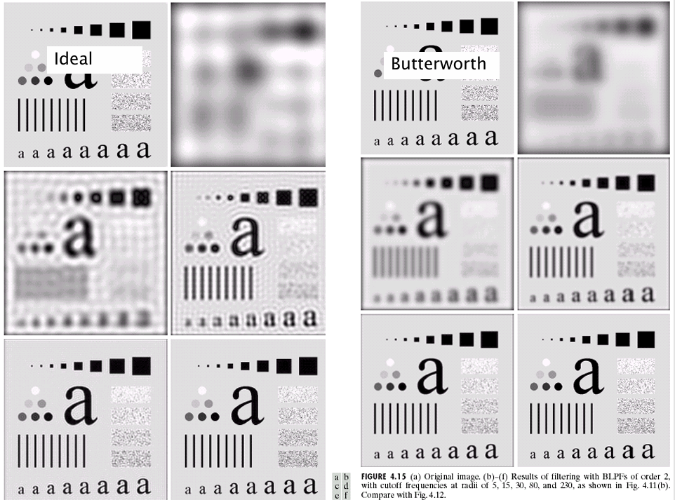 좌측은 Ideal Lowpass Filters, 우측은 Butterworth Lowpass Filters를 동일한 조건에서 적용했을 때 이미지 차이를 보여준다. Ideal 필터는 이론적으로 명확하지마나 Ringing 현상이 큼을 확인할 수 있다. Butterworth 필터는 현실적 적용에 더 적합하며, 자연스러운 흐림 효과를 제공한다. 실제 이미지 처리에서는 Butterworth 필터가 더 안정적이다.
