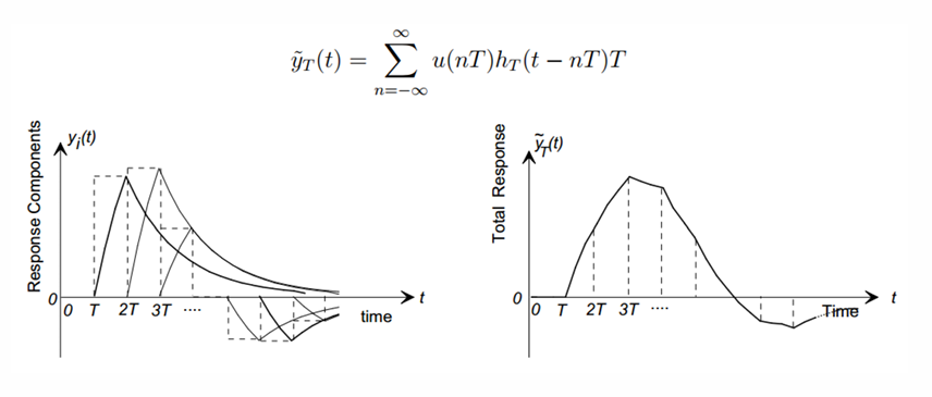 입력 u(t)를 샘플링하고, 각 샘플 값 u(nT)에 대응하는 시스템 응답을 합산하여 근사 출력 y~T(t)를 계산한다.
