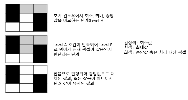 Adpative Median Filter는 두 단계(Level A, Level B)로 동작한다.