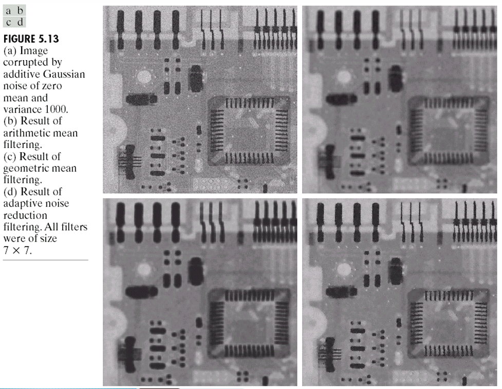 위 이미지의 가장 우측 하단 이미지가 Adaptive noise reduction filtering을 적용한 결과이다. Arithmetic mean filtering이나 Geometric mean fitering보다 훨씬 노이즈 개선이 잘 되어 보인다.