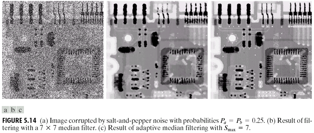 가장 우측이 Adaptive median Filtering을 적용한 결과이다. 잡음을 제거하면서도, 경계나 세부 패턴의 디테일이 더 살아있는 것을 확인할 수 있다.