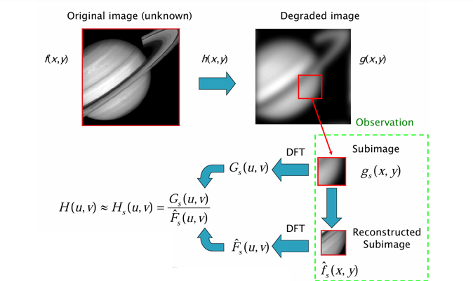 한편, 영상 복원을 위해서는 열화 함수(Degradation Function)의 추정이 필요하다. 이는 영상이 어떻게 열화되었는지를 수학적으로 모델링하거나(Estimation by Modeling), 관측된 영상 데이터를 기반으로 직접 추정하여(Estimating the Degradation Funtion) 복원 필터를 설계하는 단계이다.