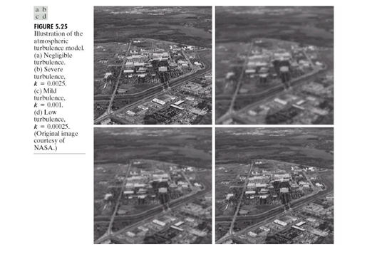 (c) Mild turbulence, k=0.001, 중간 정도의 흐림을 보여준다. 윤곽은 남아 있으나 미세한 디테일이 손실되어 보인다.