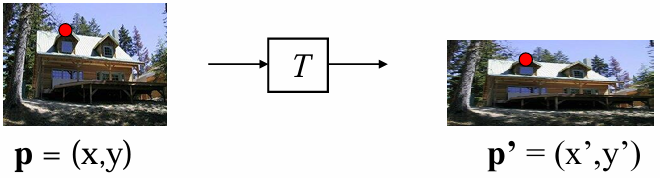 여기서 은 변환을 정의하는 행렬이며, 이 행렬의 형태에 따라 변환이 이동/회전/스케일/아핀/투영으로 나뉜다.
