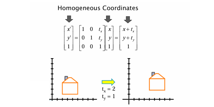 앞서 언급했듯이, 이동 변환은 단순한 2x2 행렬로 표현할 수 없다. 하지만 Homogeneous Coordinates를 사용하면 이를 3x3 행렬로 깔끔하게 표현할 수 있다.