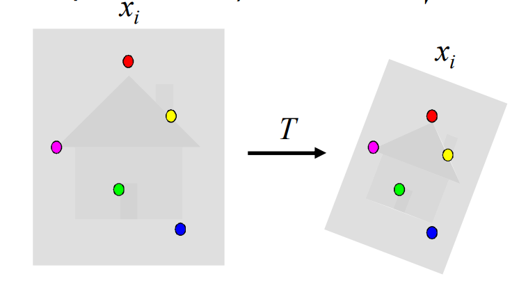 여기서 목표는 한 이미지의 점들을 다른 이미지의 대응점에 가장 잘 맞추는 변환(Transformation) 를 찾는 것이다.