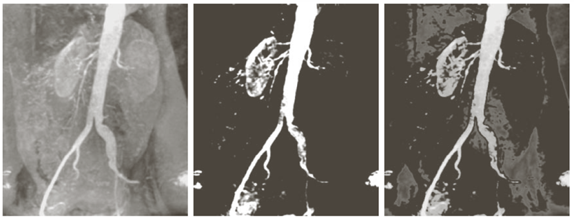 위 이미지의 가장 왼쪽이미지는 원본 영상이다. 가운데 이미지는 Binary Highlighting 방식으로 혈관 부분만 흰색, 배경은 검정색임을 볼 수 있다. 가장 오른쪽 이미지는 Preserve 방식으로 특정 영역을 black으로 만들고 혈관과 콩팥 부분은 보존하여 혈관과 콩팥을 강조하는 영상을 만들었다.