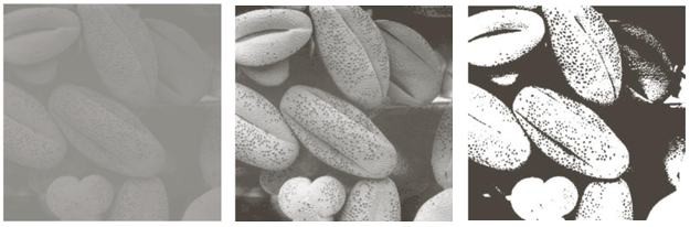 위 이미지 중 가운데 이미지에서 볼 수 있듯이, Contrast Stretching을 적용한 결과 씨앗의 패턴과 형태가 뚜렷하게 나타난다. 이는 중간 톤 대비가 크게 향상된 덕분이다. 반면, Thresholding 기법은 객체와 배경을 구분할 수는 있지만, 디테일을 모두 제거해 영상의 질감을 잃게 만든다.