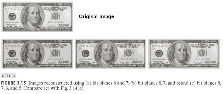 위 이미지의 (a),(b),(c)는 각각 비트 평면을 (8,7), (8,7,6), (8,7,6,5)로 조합하여 원본 이미지를 재구성하는 과정을 보인다. 명암 대비 측면이나, 벤딩 현상 등이미지의 주요 형태는 보이지만 디테일이 조금씩 떨어지는 것을 확인할 수 있다.