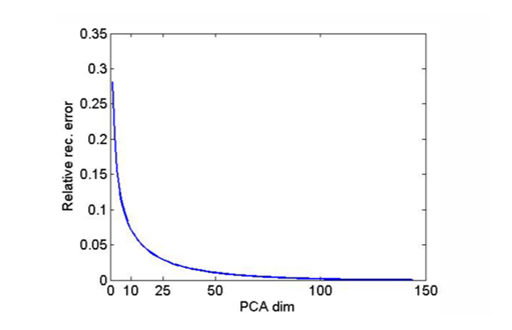 아래 그래프에서 보듯이, 처음 몇 개의 성분만 선택해도 오차가 급격히 감소하고, 이후에는 느리게 감소한다.