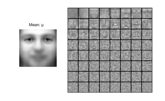 위 그림의 왼쪽은 평균 얼굴(mean face, μ)이다. 이는 모든 학습 이미지를 평균낸 것이다.