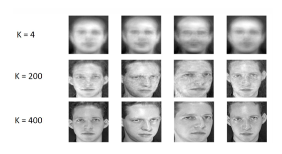 학습한 Eigenfaces를 사용해 원본 얼굴을 근사할 수 있다. K(선택된 고유벡터 개수)에 따라 재구성 정확도가 달라진다.
