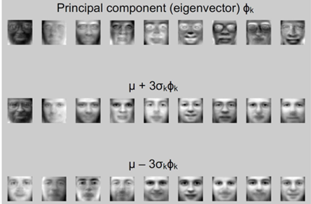 중앙의 주성분()을 기준으로, 평균 얼굴 μ에 이를 더하거나 빼면 다양한 얼굴 형태가 나타난다.