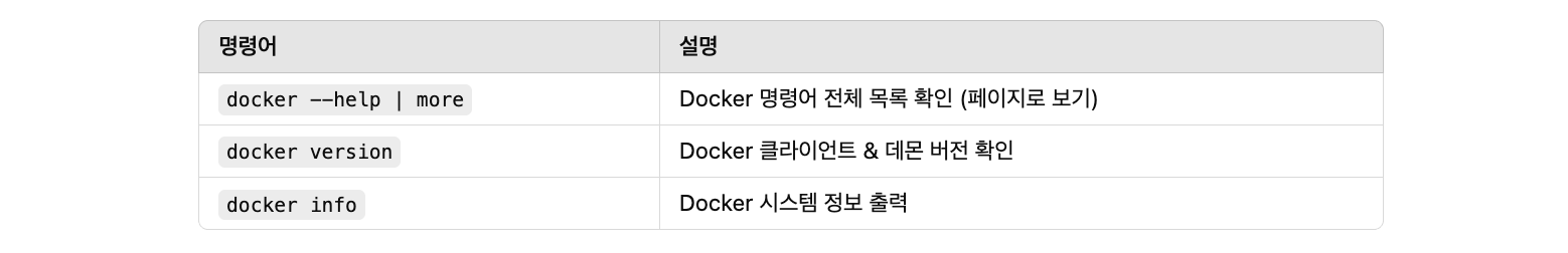 - Docker Daemon : Docker의 핵심 엔진으로, 클라이언트의 명령어를 받아서 이미지 생성, 컨테이너 실행 등을 실제로 처리한다.