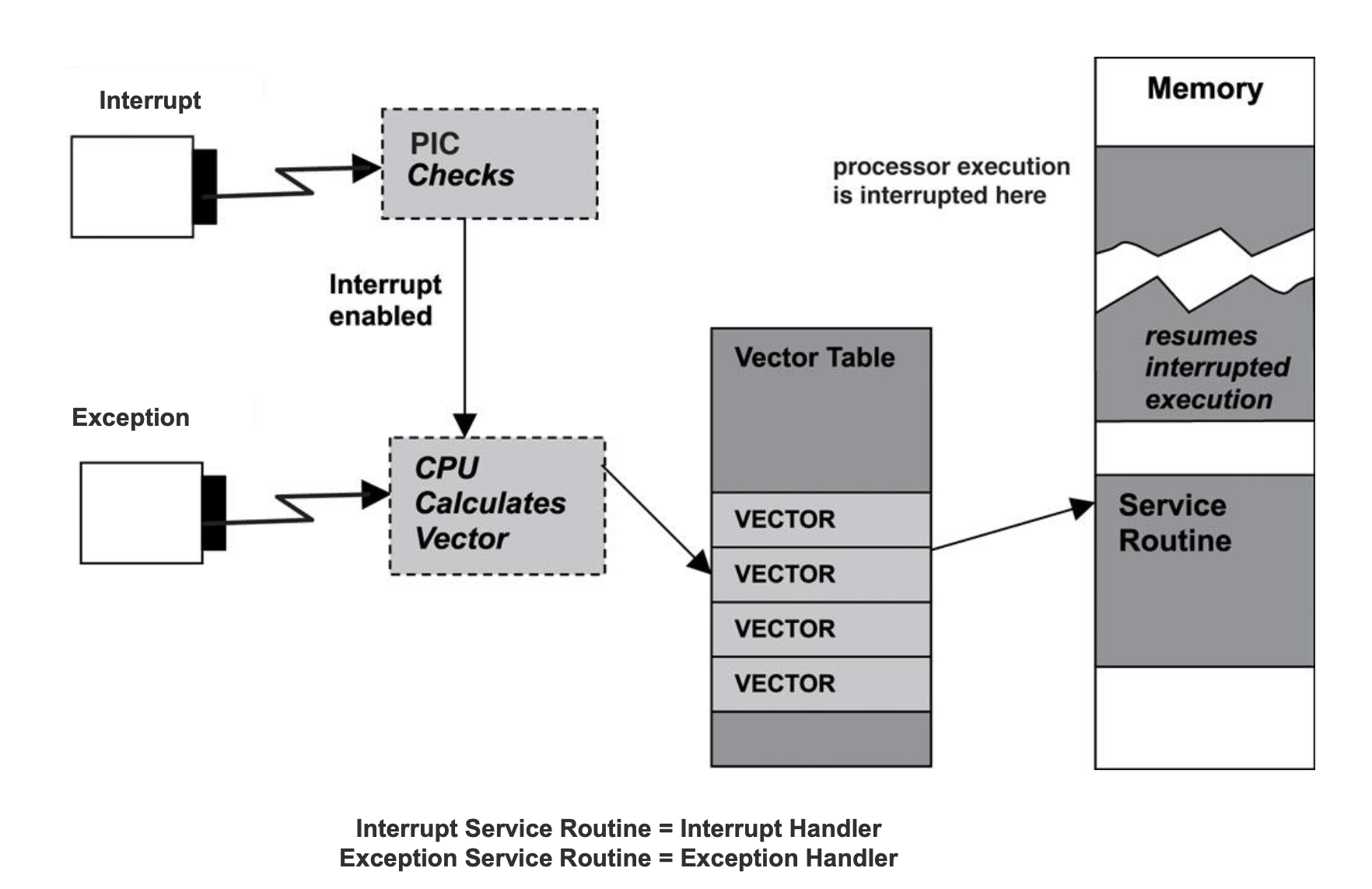 컴퓨터 시스템이 예외(Exception)나 인터럽트(Interrupt)를 처리할 수 있는 이유는, 시스템이 이를 벡터 테이블(Vector table)이라는 데이터 구조로 관리하기 때문이다. 이 벡터 테이블은 특정 예외나 인터럽트가 발생했을 때, 해당 이벤트를 처리할 수 있는 서비스 루틴의 주소를 저장하고 있는 표이다.