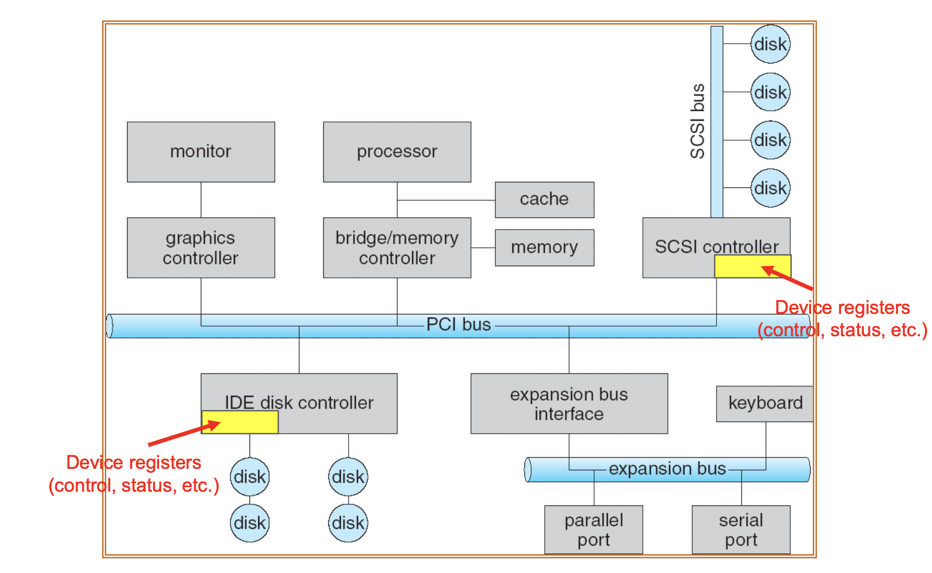 각 장치는 디바이스 컨트롤러(device controller) 라는 칩을 통해 제어되며, 이 컨트롤러는 데이터를 장치로 전송하거나 장치로부터 수신하는 일을 맡는다. 또한, 장치 제어 레지스터(device control registers) 는 장치를 초기화하고 요청을 보내는 데 사용되며, 일반적으로 CPU 외부에 위치한다. 상위 계층에서는 이러한 레지스터를 통해 장치에게 작업을 지시하고, 데이터를 읽거나 쓴다. 이러한 과정을 디바이스 제어(device control) 라고 한다.