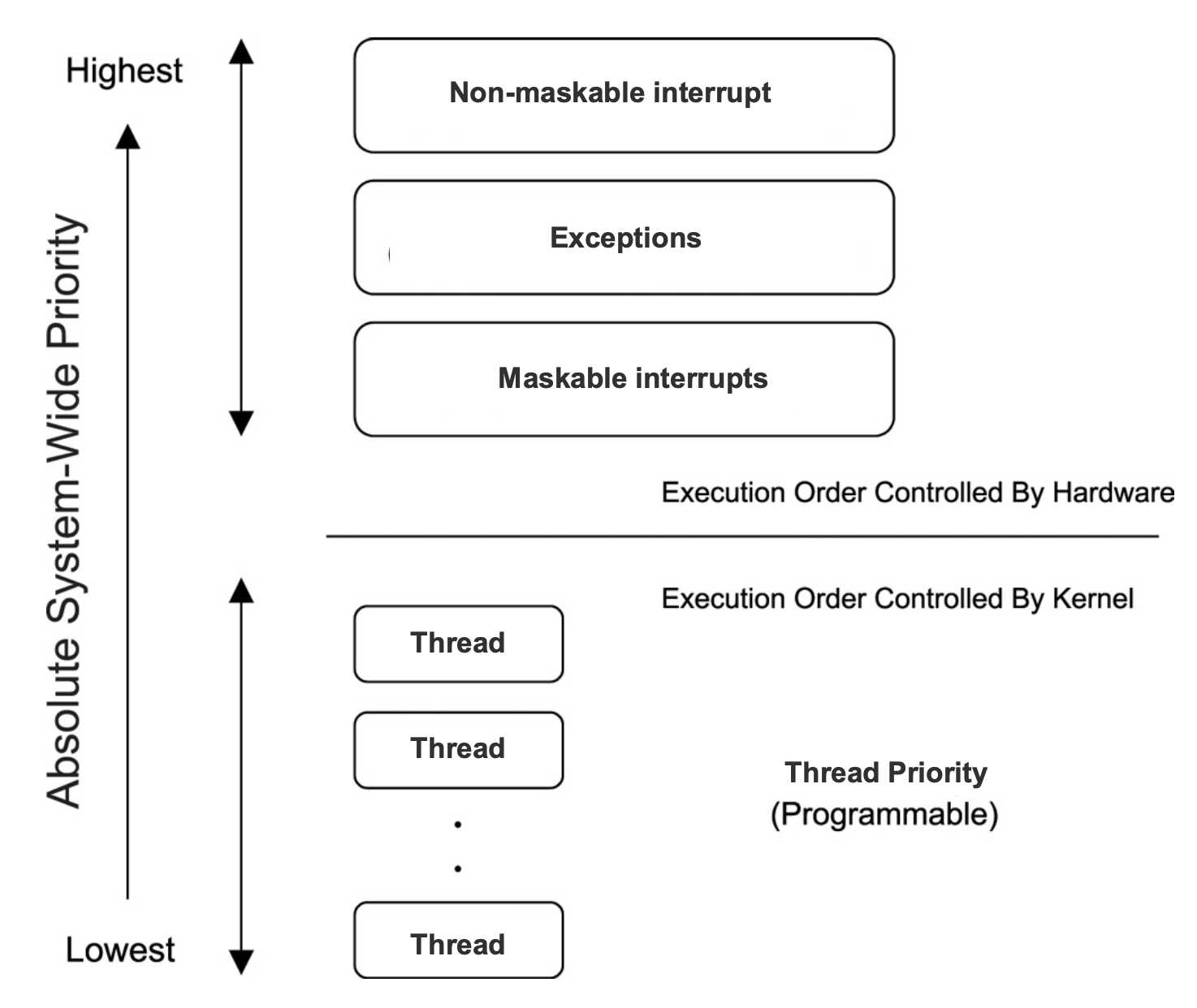 모든 프로세서는 예외와 인터럽트를 정해진 우선순위 순서에 따라 처리한다. 일반적으로 아래와 같은 순서로 우선순위가 주어진다.