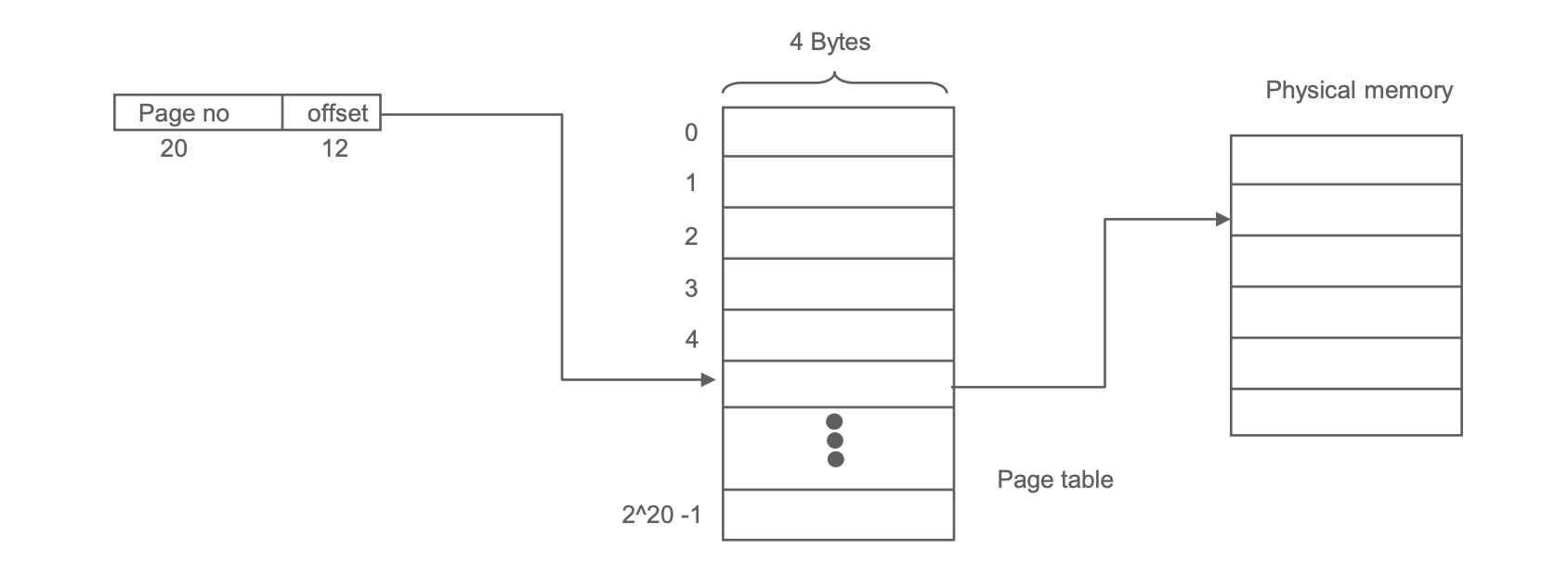 32비트 시스템에서 페이지 크기가 4KB(212)이고 각 페이지 엔트리가 4바이트라면, 전체 논리 주소 공간을 위한 페이지 테이블의 크기는 다음과 같이 계산된다.