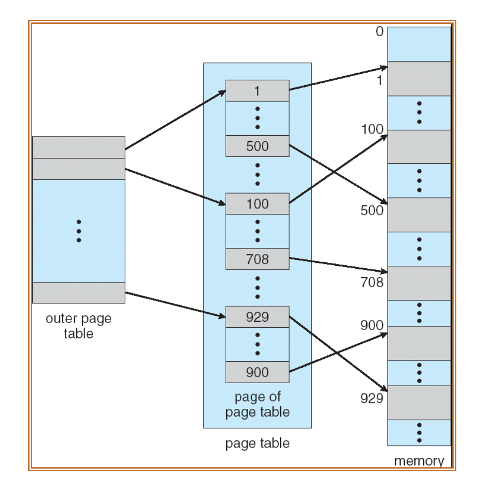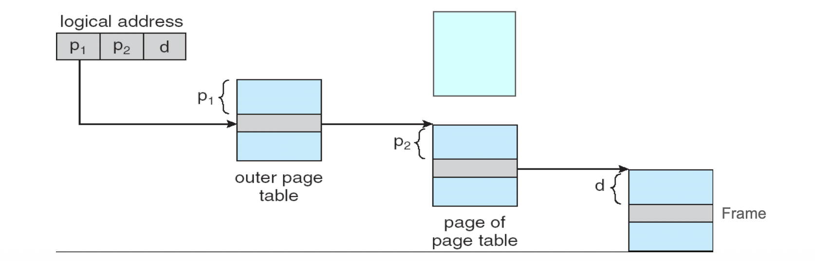 즉, 가상 주소는 <p1, p2, d>로 구성되고, 두 단계에 걸쳐 물리 프레임으로 접근한다.