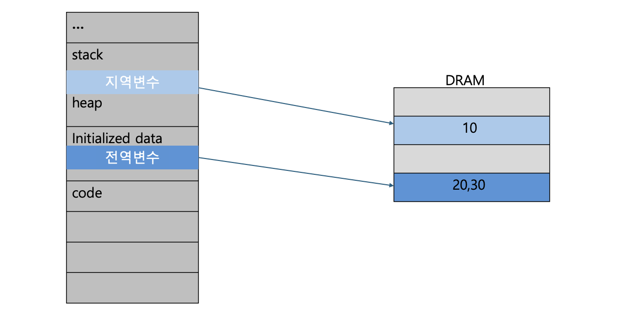 위 코드의 경우 전역변수는 initialized Data 섹션, 지역 변수는 stack이 DRAM과 매핑되어 있으므로 데이터를 정상적으로 저장할 수 있다.