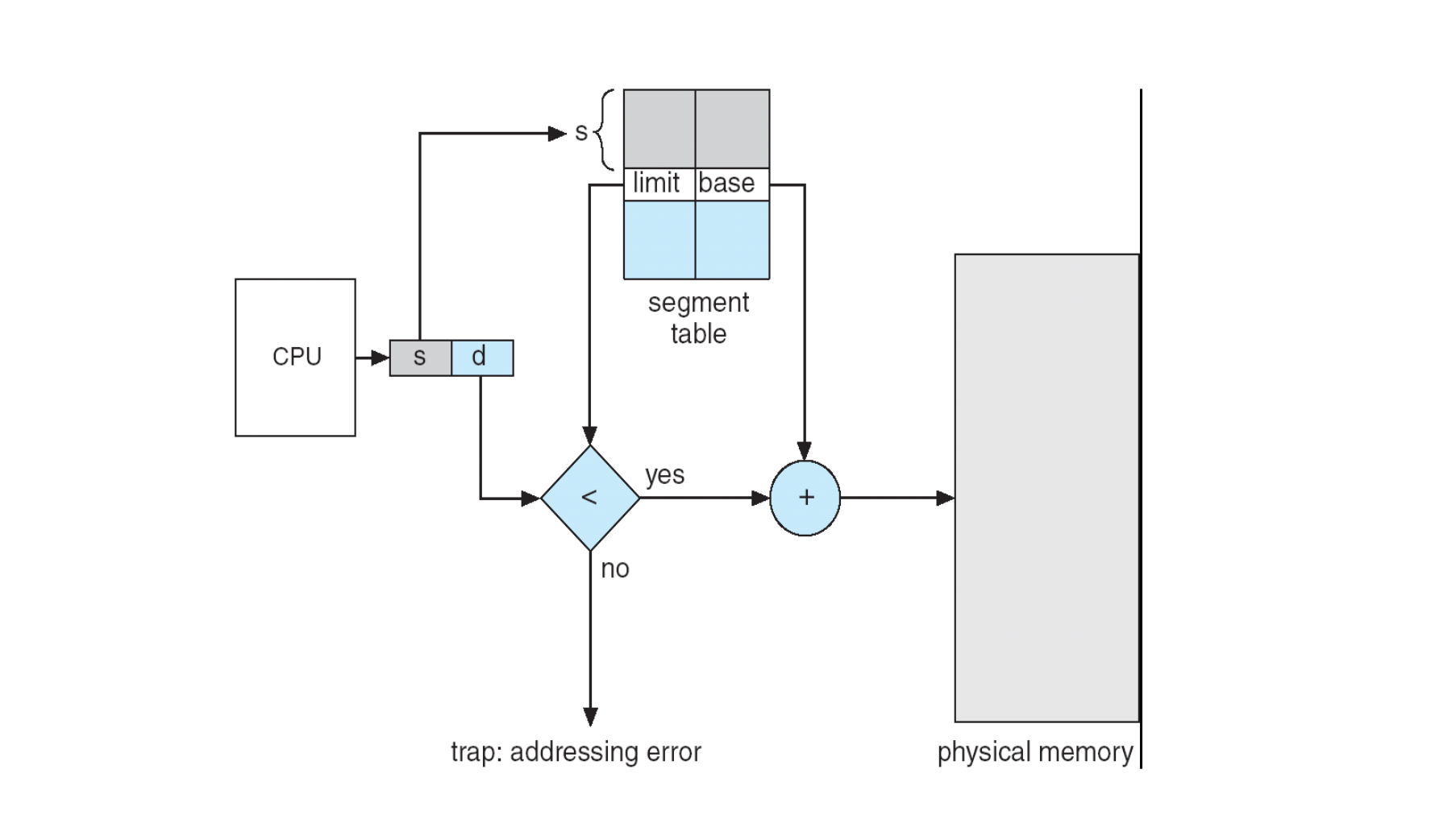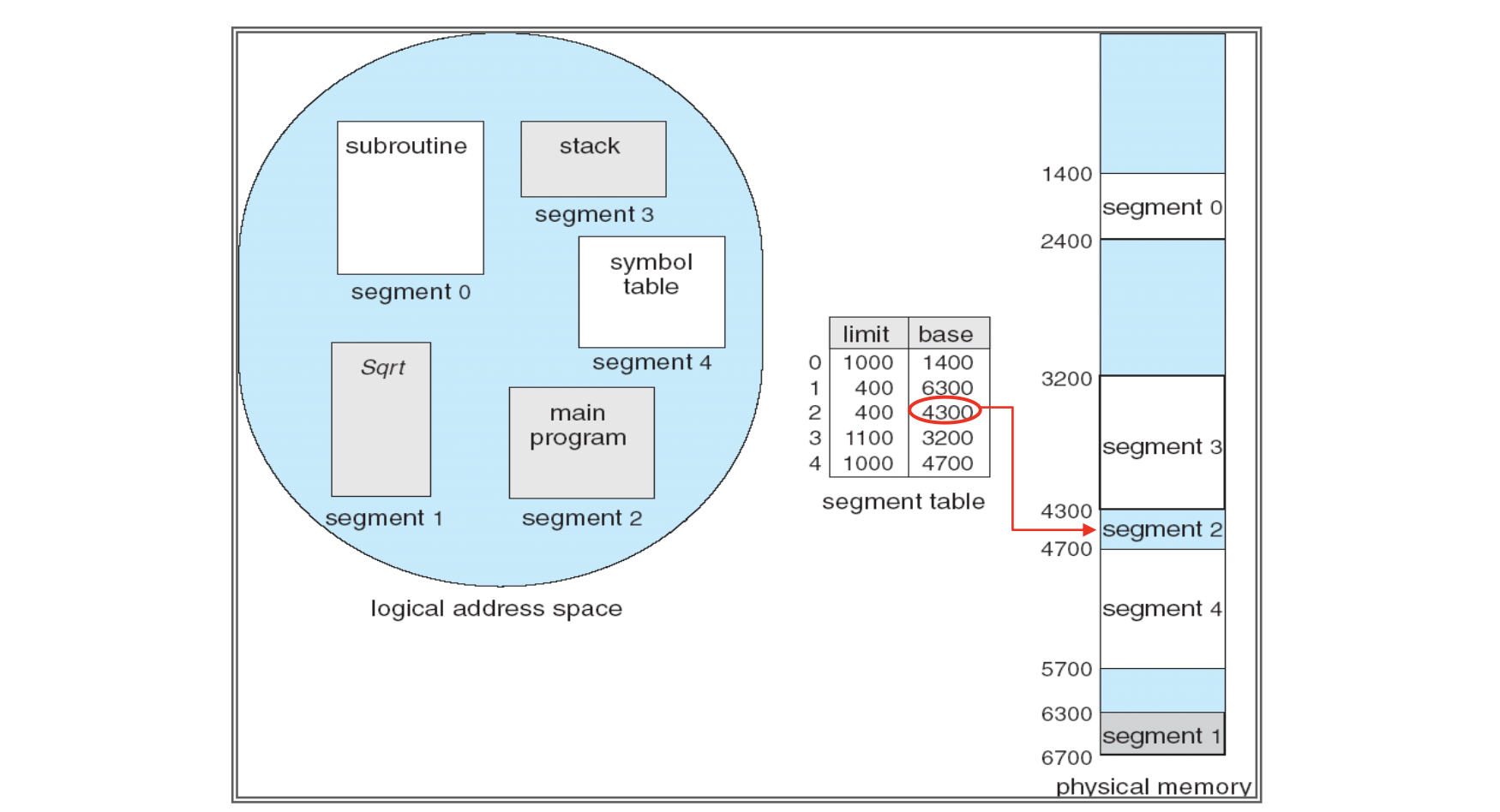 세그먼트 테이블은 각 세그먼트의 시작 주소(base)와 길이(limit)를 저장하며, CPU가 생성한 <세그먼트 번호, 오프셋>을 통해 물리 주소로 변환한다. 예를 들어, 세그먼트 2의 바이트 53번은 base + offset = 4300 + 53 = 4353으로 변환된다.