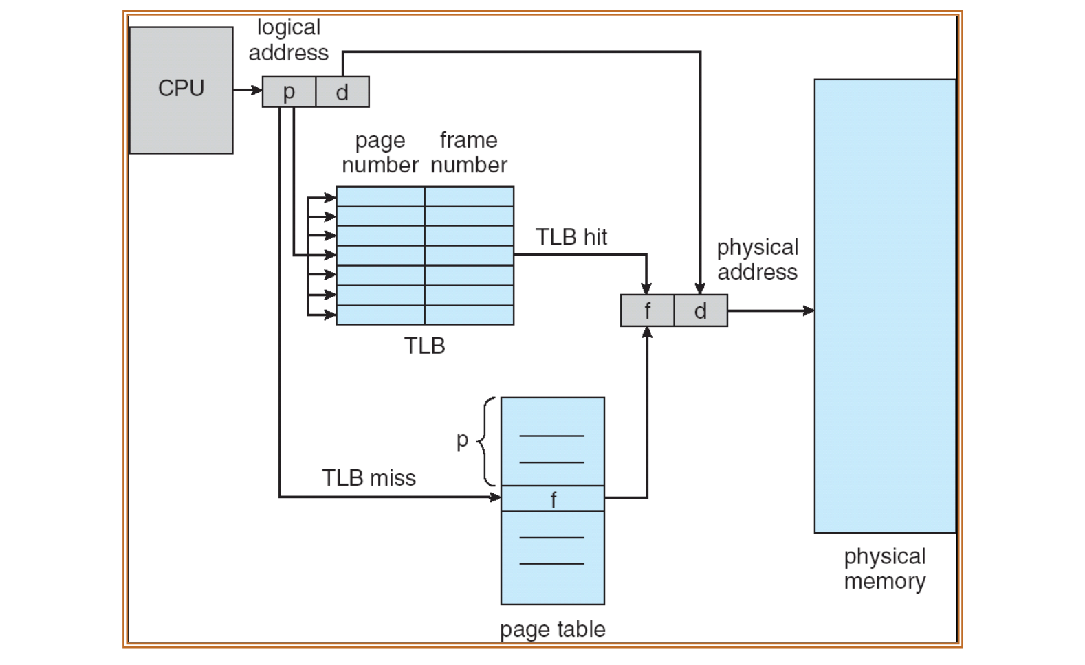 이때 등장하는 것이 TLB(Translation Look-aside Buffer)다. TLB는 최근에 접근한 가상 페이지 번호와 물리 프레임 번호의 매핑 정보를 저장하는 고속 캐시이다. 일반적으로 TLB는 하드웨어에 내장되어 있어 접근 속도가 매우 빠르며, 페이지 테이블을 매번 조회하지 않아도 된다. CPU가 메모리에 접근할 때 먼저 TLB를 확인하고, 만약 원하는 페이지에 대한 정보가 있다면 이를 TLB hit이라고 한다. 반대로 없다면 TLB miss가 발생하며, 이 경우 페이지 테이블을 조회해 다시 TLB에 해당 정보를 저장하게 된다.