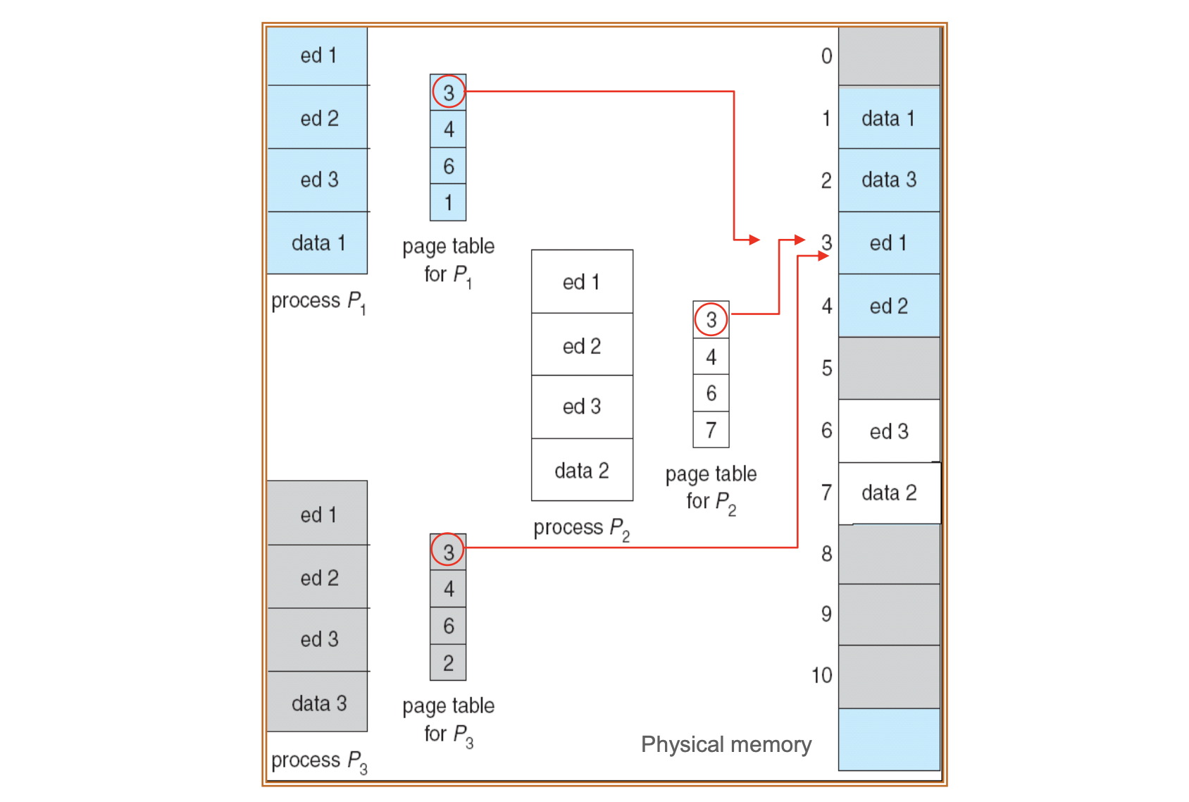 하나의 코드 복사본만 물리 메모리에 유지하고, 각 프로세스의 페이지 테이블이 이 공통 복사본을 참조하도록 하면 물리 메모리를 절약할 수 있다. 반면, 데이터 페이지는 프로세스마다 다르므로 개별적으로 매핑된다.