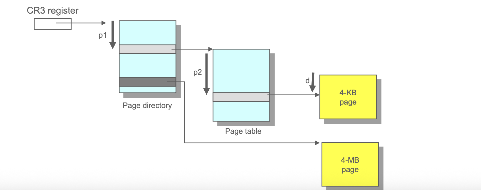 Pentium은 두 가지 페이지 크기를 지원한다. (4KB, 4MB) 4KB 페이지를 사용하는 경우, 2단계 페이징이 적용되며 다음과 같이 가상 주소가 구성된다.(10비트 page directory p1, 10비트 Page table p2, 12비트 offset d)
